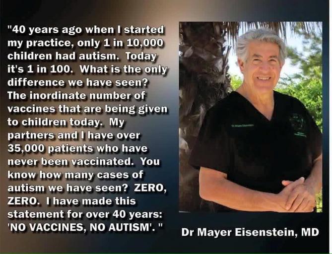 | Keywords: anti vaccine vaccination vax disease health poison population control needle syringe 40 years ago when I started my practice, only 1 in 10,000 children had autism. Today it's 1 in 100. What is the only difference we have seen? The inordinate number of vaccines that are being given to children today. My partners and I who have never been vaccinated. You know how many cases of autism we have seen? Zero, Zero. I have made this statement for over 40 years. No vaccines, no autism. Dr. Mayer Eisentein, MD. Anti Vaccination meme collected by A.J. Wilson of iPressThis at FlatEarth.Online, made by others. 40 years ago when I started my practice, only 1 in 10,000 children had autism. Today it's 1 in 100. What is the only difference we have seen? The inordinate number of vaccines that are being given to children today. My partners and I who have never been vaccinated. You know how many cases of autism we have seen? Zero, Zero. I have made this statement for over 40 years. No vaccines, no autism. Dr. Mayer Eisentein, MD. Anti Vaccination meme collected by A.J. Wilson of iPressThis at FlatEarth.Online, made by others. |