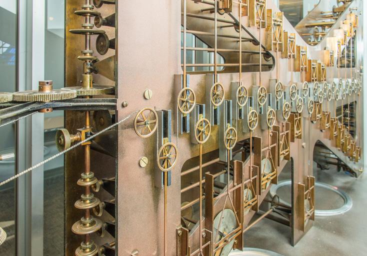 | Keywords: NOAA's Tide Predicting Machine No. 2.jpg en This photo shows the largest of the three sections of Tide Predicting Machine No 2 a special purpose mechanical analog computer for predicting the height and time of high and low tides The gears on the left transmit power from the hand crank The components on the right contribute to the computation of the time of high and low tides The U S government used Tide Predicting Machine No 2 from 1910 to 1965 to predict tides for ports around the world The machine also known as Old Brass Brains uses an intricate arrangement of gears pulleys chains slides and other mechanical components to perform the computations A person using the machine would require 2-3 days to compute a year ™s tides at one location A person performing the same calculations by hand would require hundreds of days to perform the work The machine is 10 8 feet 3 3 m long 6 2 feet 1 9 m high and 2 0 feet 0 61 m wide and weighs approximately 2 500 pounds 1134 kg The operator powers the machine with a hand crank The National Oceanographic and Atmospheric Administration NOAA maintains the machine in working order 2016-03-14 11 19 54 own Steven Fine other versions 38 991561666667 -77 029463333333 cc-zero Machines Analog computers National Oceanic and Atmospheric Administration Silver Spring Maryland Tides Harmonic analysis Maritime navigation Mechanical calculators Tide-predicting machines navigation |
