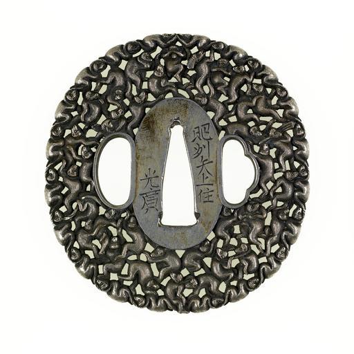 | Keywords: Noda Mitsuhiro II - Tsuba with One Hundred Monkeys - Walters 51133.jpg One hundred monkeys was a typical motif for Mitsuhiro and other members of his school A multitude of monkeys are carved into the body of the tsuba Their eyes are highlighted in gold Hidden throughout the design are monkeys with special characteristics In the upper portion are the three monkeys who see no evil hear no evil and speak no evil At the lower right two monkeys are neck-wrestling with a rope tied around their necks In the upper left section a monkey holds a giant peach At the lower left a monkey has a bag over its shoulder In the upper right is a monkey carrying fan or a baton This tsuba is similar to another in the Walters collection by the same artist made of copper 51 112 Other known examples by Mitsuhiro are almost all in the same style with a single motif carved throughout the tsuba between 1770 1823 Edo silver cm 7 25 6 88 0 52 accession number 51 133 21366 Henry Walters Baltimore date and mode of acquisition unknown Walters Art Museum Henry Walters Acquired by Henry Walters hishu yagami ju/mitsuhiro; Translation Living at Yagami in Hizen province/Mitsuhiro place of origin Edo present-day Tokyo Japan Walters Art Museum license Tsuba in the Walters Art Museum Noda Mitsuhiro II Media contributed by the Walters Art Museum needs category review Reliefs of monkeys on Japanese sword fittings |