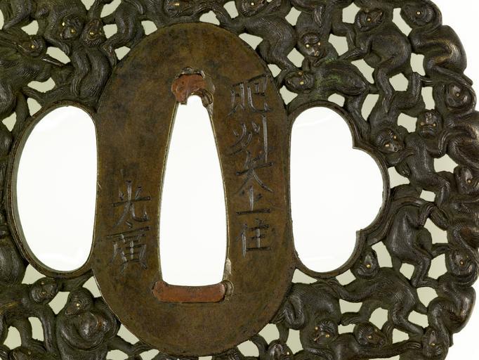 | Keywords: Noda Mitsuhiro II - Tsuba with One Hundred Monkeys - Walters 51112 - Mark B.jpg One hundred monkeys was a typical motif for Mitsuhiro and other members of his school A multitude of monkeys are carved into the body of the tsuba Their eyes are highlighted in gold Hidden throughout the design are monkeys with special characteristics In the upper portion are the three monkeys who see no evil hear no evil and speak no evil At the bottom two monkeys are neck-wrestling with a rope tied around their necks In the upper left section is a monkey carrying fan or a baton Below a monkey holds a giant peach At the lower right a monkey has a bag over its shoulder This tsuba is similar to another in the Walters collection by the same artist made of silver 51 133 Other known examples by Mitsuhiro are almost all in the same style with a single motif carved throughout the tsuba between 1748 1823 late Edo sentoku gold copper cm 7 28 6 92 0 47 accession number 51 112 14744 Henry Walters Baltimore date and mode of acquisition unknown Walters Art Museum Henry Walters Acquired by Henry Walters Transcription Hishu Yagami ju/Mitsuhiro; Translation Living at Yagami in Hizen province/Mitsuhiro; Transcription Sentoku kin i saku kore; Translation This was made with sentoku and gold place of origin Edo present-day Tokyo Japan Walters Art Museum license Tsuba in the Walters Art Museum Noda Mitsuhiro II Media contributed by the Walters Art Museum needs category review Reliefs of monkeys on Japanese sword fittings |