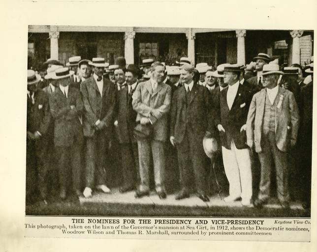 Keywords: sea girt seagirt campaign 1912 woodrow wilson woodrowwilson president vice president vicepresident thomas r. marshall thomasrmarshall monochrome Local Accession Number: 1006 Description: "Photograph taken on the lawn of Wilson's mansion at Sea Girt shows the Democratic nominees, Woodrow Wilson and Thomas R. Marshall, surrounded by prominent committeemen." Photographer: Underwood and Underwood Source: Research Library, 20th Century Fox Size: 7x9 Medium: Print, Black and White Date: 1912 Local Accession Number: 1006 Description: "Photograph taken on the lawn of Wilson's mansion at Sea Girt shows the Democratic nominees, Woodrow Wilson and Thomas R. Marshall, surrounded by prominent committeemen." Photographer: Underwood and Underwood Source: Research Library, 20th Century Fox Size: 7x9 Medium: Print, Black and White Date: 1912 |
