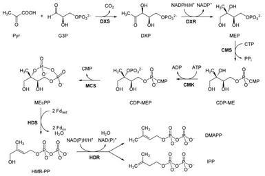 Keywords: Non-mevalonate pathway.svg en the non-mevalonate pathway overview de der Methylerithritolphosphatweg own Yikrazuul 24 November Biosyntheses Hemiterpenes Organophosphates