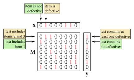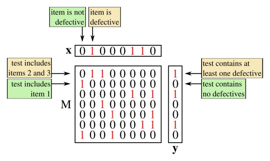 Keywords: Nonadaptive Group Testing.svg en A typical group testing setup A non-adaptive algorithm first chooses the matrix M and is then given the vector y The problem is then to find an estimate for x 2016-10-19 own CheCheDaWaff other versions cc-zero Matrix Statistics Combinatorics |