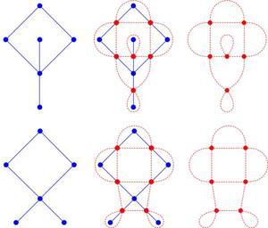 Keywords: Nonisomorphic medial graph example.svg en Two embeddings of the same graph in blue can have nonisomorphic medial graphs in red <source lang latex > \documentclass article \thispagestyle empty \usepackagemargin 0in geometry \usepackage tikz \def\nodeDist 2 5cm \tikzstyle origVertex draw blue fill shape circle \tikzstyle newVertex draw red fill shape circle \tikzstyle invisibleVertex shape circle \tikzstyle origEdge blue \tikzstyle newEdge red densely dashed \tikzstyle invisibleEdge draw opacity 0 \begin document \begin tikzpicture node distance \nodeDist semithick \nodeorigVertex 0 ; \nodeorigVertex 1 below of 0 ; \nodeorigVertex 2 left of 1 ; \nodeorigVertex 3 right of 1 ; \nodeorigVertex 4 below of 1 ; \nodeorigVertex 5 below of 4 ; \path 0 edgeorigEdge nodeinvisibleVertex m0 2 edgeorigEdge nodeinvisibleVertex m1 3 1 edgeorigEdge nodeinvisibleVertex m2 4 2 edgeorigEdge nodeinvisibleVertex m3 4 3 edgeorigEdge nodeinvisibleVertex m4 4 4 edgeorigEdge nodeinvisibleVertex m5 5 ; \path m0 edgeinvisibleEdge out 90 in 90 looseness 2 m1 edgeinvisibleEdge m1 edgeinvisibleEdge out 180 in 180 looseness 2 m3 edgeinvisibleEdge m3 m1 edgeinvisibleEdge out 0 in 0 looseness 2 m4 edgeinvisibleEdge m4 m2 edgeinvisibleEdge out 125 in 55 looseness 30 m2 edgeinvisibleEdge m3 edgeinvisibleEdge m4 m3 edgeinvisibleEdge bend right m5 m4 edgeinvisibleEdge bend left m5 m5 edgeinvisibleEdge out -125 in -55 looseness 30 m5 ; \end tikzpicture \begin tikzpicture node distance \nodeDist semithick \nodeorigVertex 0 ; \nodeorigVertex 1 below of 0 ; \nodeorigVertex 2 left of 1 ; \nodeorigVertex 3 right of 1 ; \nodeorigVertex 4 below of 1 ; \nodeorigVertex 5 below of 4 ; \path 0 edgeorigEdge nodenewVertex m0 2 edgeorigEdge nodenewVertex m1 3 1 edgeorigEdge nodenewVertex m2 4 2 edgeorigEdge nodenewVertex m3 4 3 edgeorigEdge nodenewVertex m4 4 4 edgeorigEdge nodenewVertex m5 5 ; \path m0 edgenewEdge out 90 in 90 looseness 2 m1 edgenewEdge m1 edgenewEdge out 180 in 180 looseness 2 m3 edgenewEdge m3 m1 edgenewEdge out 0 in 0 looseness 2 m4 edgenewEdge m4 m2 edgenewEdge out 125 in 55 looseness 30 m2 edgenewEdge m3 edgenewEdge m4 m3 edgenewEdge bend right m5 m4 edgenewEdge bend left m5 m5 edgenewEdge out -125 in -55 looseness 30 m5 ; \end tikzpicture \begin tikzpicture node distance \nodeDist semithick \nodeinvisibleVertex 0 ; \nodeinvisibleVertex 1 below of 0 ; \nodeinvisibleVertex 2 left of 1 ; \nodeinvisibleVertex 3 right of 1 ; \nodeinvisibleVertex 4 below of 1 ; \nodeinvisibleVertex 5 below of 4 ; \path 0 edgeinvisibleEdge nodenewVertex m0 2 edgeinvisibleEdge nodenewVertex m1 3 1 edgeinvisibleEdge nodenewVertex m2 4 2 edgeinvisibleEdge nodenewVertex m3 4 3 edgeinvisibleEdge nodenewVertex m4 4 4 edgeinvisibleEdge nodenewVertex m5 5 ; \path m0 edgenewEdge out 90 in 90 looseness 2 m1 edgenewEdge m1 edgenewEdge out 180 in 180 looseness 2 m3 edgenewEdge m3 m1 edgenewEdge out 0 in 0 looseness 2 m4 edgenewEdge m4 m2 edgenewEdge out 125 in 55 looseness 30 m2 edgenewEdge m3 edgenewEdge m4 m3 edgenewEdge bend right m5 m4 edgenewEdge bend left m5 m5 edgenewEdge out -125 in -55 looseness 30 m5 ; \end tikzpicture \begin tikzpicture node distance \nodeDist semithick \nodeorigVertex 0 ; \nodeinvisibleVertex 1 below of 0 ; \nodeorigVertex 2 left of 1 ; \nodeorigVertex 3 right of 1 ; \nodeorigVertex 4 below of 1 ; \nodeorigVertex 5 below left of 4 ; \nodeorigVertex 6 below right of 4 ; \path 0 edgeorigEdge nodeinvisibleVertex m0 2 edgeorigEdge nodeinvisibleVertex m1 3 2 edgeorigEdge nodeinvisibleVertex m2 4 3 edgeorigEdge nodeinvisibleVertex m3 4 4 edgeorigEdge nodeinvisibleVertex m4 5 edgeorigEdge nodeinvisibleVertex m5 6 ; \path m0 edgeinvisibleEdge out 90 in 90 looseness 2 m1 edgeinvisibleEdge m1 edgeinvisibleEdge out 180 in 180 looseness 2 m2 edgeinvisibleEdge m2 m1 edgeinvisibleEdge out 0 in 0 looseness 2 m3 edgeinvisibleEdge m3 m2 edgeinvisibleEdge m3 edgeinvisibleEdge m4 m3 edgeinvisibleEdge m5 m4 edgeinvisibleEdge out -170 in -100 looseness 30 m4 edgeinvisibleEdge m5 m5 edgeinvisibleEdge out -80 in -10 looseness 30 m5 ; \end tikzpicture \begin tikzpicture node distance \nodeDist semithick \nodeorigVertex 0 ; \nodeinvisibleVertex 1 below of 0 ; \nodeorigVertex 2 left of 1 ; \nodeorigVertex 3 right of 1 ; \nodeorigVertex 4 below of 1 ; \nodeorigVertex 5 below left of 4 ; \nodeorigVertex 6 below right of 4 ; \path 0 edgeorigEdge nodenewVertex m0 2 edgeorigEdge nodenewVertex m1 3 2 edgeorigEdge nodenewVertex m2 4 3 edgeorigEdge nodenewVertex m3 4 4 edgeorigEdge nodenewVertex m4 5 edgeorigEdge nodenewVertex m5 6 ; \path m0 edgenewEdge out 90 in 90 looseness 2 m1 edgenewEdge m1 edgenewEdge out 180 in 180 looseness 2 m2 edgenewEdge m2 m1 edgenewEdge out 0 in 0 looseness 2 m3 edgenewEdge m3 m2 edgenewEdge m3 edgenewEdge m4 m3 edgenewEdge m5 m4 edgenewEdge out -170 in -100 looseness 30 m4 edgenewEdge m5 m5 edgenewEdge out -80 in -10 looseness 30 m5 ; \end tikzpicture \begin tikzpicture node distance \nodeDist semithick \nodeinvisibleVertex 0 ; \nodeinvisibleVertex 1 below of 0 ; \nodeinvisibleVertex 2 left of 1 ; \nodeinvisibleVertex 3 right of 1 ; \nodeinvisibleVertex 4 below of 1 ; \nodeinvisibleVertex 5 below left of 4 ; \nodeinvisibleVertex 6 below right of 4 ; \path 0 edgeinvisibleEdge nodenewVertex m0 2 edgeinvisibleEdge nodenewVertex m1 3 2 edgeinvisibleEdge nodenewVertex m2 4 3 edgeinvisibleEdge nodenewVertex m3 4 4 edgeinvisibleEdge nodenewVertex m4 5 edgeinvisibleEdge nodenewVertex m5 6 ; \path m0 edgenewEdge out 90 in 90 looseness 2 m1 edgenewEdge m1 edgenewEdge out 180 in 180 looseness 2 m2 edgenewEdge m2 m1 edgenewEdge out 0 in 0 looseness 2 m3 edgenewEdge m3 m2 edgenewEdge m3 edgenewEdge m4 m3 edgenewEdge m5 m4 edgenewEdge out -170 in -100 looseness 30 m4 edgenewEdge m5 m5 edgenewEdge out -80 in -10 looseness 30 m5 ; \end tikzpicture \end document </source> Self 2012-12-09 Undirected planar graphs Images with LaTeX source code Cc-zero |
