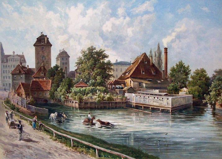 Keywords: Nonnenmühle v. Nord.jpg de Die Nonnenmühle in Leipzig von Norden mit den beiden Wasserkünsten links Aquarell von Ernst Heyn um 1890 Stadtgeschichtliches Museum Leipzig Inv Nr H 474 Ernst Heyn 1841-1894 1890 Mills in Leipzig Flussbäder in Leipzig Ernst Friedrich Heyn PD-old |