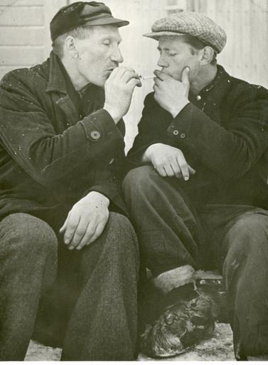 Keywords: andre verdenskrig andreverdenskrig 2. verdenskrig 2verdenskrig nordnorske flyktninger nordnorskeflyktninger nordmenn i sverige under krigen nordmennisverigeunderkrigen world war ii worldwarii vårslipp vårslipp 2012 vårslipp2012 tvangsevakuering monochrome Flyktninger fra Nord-Norge til Sverige. Under tyskernes tvangsevakuering i Nord-Norge oktober 1944 lyktes det en del av sivilbefolkningen å ta seg over til Sverige. Under store strabaser og lidelser, hvorunder det også inntraff dødsfall, strevet de seg frem over fjellviddene inntil de tilslutt var i sikkerhet på svensk område. Bildet viser to norske fiskere etter ankomsten til Karesuando. Det smaker godt med en røk etter strabasene! Stockholm 24.1.45. RA/Pa-1209/Uc¬¬/68/1/S 5403 Flyktninger fra Nord-Norge til Sverige. Under tyskernes tvangsevakuering i Nord-Norge oktober 1944 lyktes det en del av sivilbefolkningen å ta seg over til Sverige. Under store strabaser og lidelser, hvorunder det også inntraff dødsfall, strevet de seg frem over fjellviddene inntil de tilslutt var i sikkerhet på svensk område. Bildet viser to norske fiskere etter ankomsten til Karesuando. Det smaker godt med en røk etter strabasene! Stockholm 24.1.45. RA/Pa-1209/Uc¬¬/68/1/S 5403