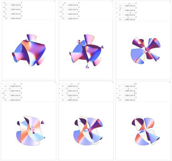 Keywords: contourplot3d nordstrandsweirdsurface mathematica 3d cg program プログラム code コード algorithm コード アルゴリズム geometric sculpture geometricsculpture shape geometry sculpture design pattern デザイン パターン graphic グラフィック グラフィクス structure 意匠 構造 symmetry 対称性 たいしょうせい シンメトリー 対称 たいしょう algorithm drawing cartoon illustration SetOptions[ContourPlot3D, Axes -&gt; None, Mesh -&gt; None, Boxed -&gt; False, ImageSize -&gt; 600, MaxRecursion -&gt; 5, PlotRange -&gt; All, PlotPoints -&gt; 50]; SetOptions[Manipulate, {SaveDefinitions -&gt; True, ContinuousAction -&gt; False}]; Manipulate[ eqn = a (x^3 (y + z) + y^3 (x + z) + z^3 (x + y)) + b (x^2 y^2 + x^2 z^2 + y^2 z^2) - c (x^2 y z + y^2 x z + z^2 x y) + 60 x y z - 4 (x y + x z + y z); ContourPlot3D[eqn == 0, {x, -r, r}, {y, -r, r}, {z, -r, r}, RegionFunction -&gt; (#1^2 + #2^2 + #3^2 &lt; r^2 &amp;)], {r, 0.5, 2, 0.1}, {a, 10, 50, 5}, {b, 30, 70, 5}, {c, 100, 150, 5} ] For more information, see Eric's MathWorld entry. SetOptions[ContourPlot3D, Axes -> None, Mesh -> None, Boxed -> False, ImageSize -> 600, MaxRecursion -> 5, PlotRange -> All, PlotPoints -> 50]; SetOptions[Manipulate, {SaveDefinitions -> True, ContinuousAction -> False}]; Manipulate[ eqn = a (x^3 (y + z) + y^3 (x + z) + z^3 (x + y)) + b (x^2 y^2 + x^2 z^2 + y^2 z^2) - c (x^2 y z + y^2 x z + z^2 x y) + 60 x y z - 4 (x y + x z + y z); ContourPlot3D[eqn == 0, {x, -r, r}, {y, -r, r}, {z, -r, r}, RegionFunction -> (#1^2 + #2^2 + #3^2 < r^2 &)], {r, 0.5, 2, 0.1}, {a, 10, 50, 5}, {b, 30, 70, 5}, {c, 100, 150, 5} ] For more information, see Eric's MathWorld entry. |
