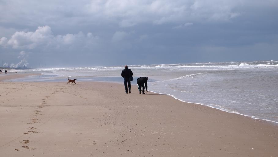 Keywords: north sea sea waves beach horizon steps people man grabs bend over air clouds imminent winter clothing tourist sand dog coast coastline netherlands print animal doggy leg
