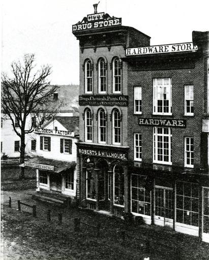 | Keywords: outdoor blackandwhite architecture building black and white Northeast corner of West Main Street at Rose, Kalamazoo, c1860 [picture] General Note: Description: Good of melodeon factory (Blakeman & Gibbs, Greek Revival), Roberts & Hillhouse City Drug Store (Italianate) and the three story brick hardware store. The white frame building at the far left behind the tree is the Tremont House hotel. This is identical to, and possibly a copy of, the Kalamazoo Valley Museum photograph 52.197. General Note: Verification: Taken after the 1853 fire and before curbs and Nicholson pavement were laid in 1866. General Note: Holdings: 1 - 10" X 8" copy print. From the Kalamazoo Public Library collection. kpl.gov Northeast corner of West Main Street at Rose, Kalamazoo, c1860 [picture] General Note: Description: Good of melodeon factory (Blakeman & Gibbs, Greek Revival), Roberts & Hillhouse City Drug Store (Italianate) and the three story brick hardware store. The white frame building at the far left behind the tree is the Tremont House hotel. This is identical to, and possibly a copy of, the Kalamazoo Valley Museum photograph 52.197. General Note: Verification: Taken after the 1853 fire and before curbs and Nicholson pavement were laid in 1866. General Note: Holdings: 1 - 10" X 8" copy print. From the Kalamazoo Public Library collection. kpl.gov |