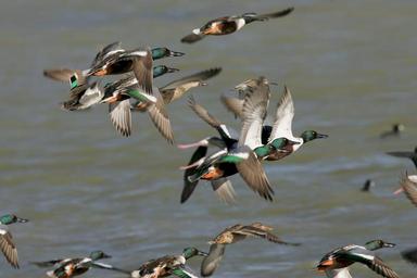Keywords: northern shoveler ducks flying birds wildlife nature water wings aquatic flock fowl waterfowl wild soaring