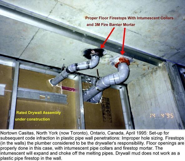 | Keywords: Nortown plastic pipe drywall.jpg Set-up for subsequent code infraction When firestops are done by separate trades instead of a speciality firestop subcontractor who does all firestopping on site mechanical electrical structural and architectural a popular cost-cutting measure is for mechanical and electrical trades to absolve themselves of sealing wall openings particularly in drywall by claiming that they have hung their pipes and wires BEFORE the drywall was up and that therefore the drywaller is responsible The drywaller has no such instructions in his specification and simply butts up to the penetrants and uses common drywall mud to close the gap which is not an approved firestop With plastic piping which melts and burns quickly in a fire this is particularly dangerous When the subtrades don't allow enough money for this pre-tender on the basis of such reasoning a budgetary battle or code infractions or both are not uncommon outcomes own 2007-08-25 Achim Hering Plumbing Cement Firestops Operable firestops Firestop mortar Concrete Plastic objects Building code violations Intumescents 3M Fire Barrier Mortar FS195 |
