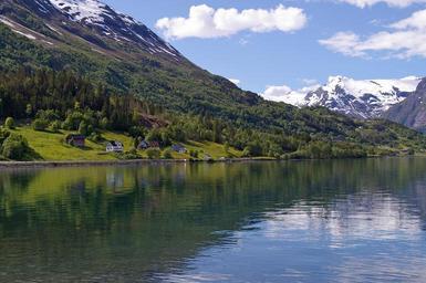 Keywords: norway fjordlandschaft mountains landscape nature hill sky summit spring holiday north clear air blue sky white clouds blue cold white fjord water recovery fish wasserspiegelung