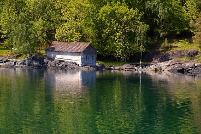 Keywords: norway fjordlandschaft mountains landscape nature spring holiday north green log cabin residential structure vacation old dwelling accommodation fjord water reflection forest trees rest relaxation boat shed