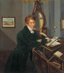 Keywords: Notar um 1830.jpg de Interieur mit einem jungen Notar an seinem Schreibpult; Öl auf Leinwand; 38 5 x 34 5 cm en Interior view with a young notary at his desk; oil on canvas; 38 4 x 34 5 cm http //www bassenge com/ ca 1830 anonymous German painter PD-old-100 notaries Offices in art Images from Galerie Bassenge 19th-century portrait paintings of sitting men Green clothing in art male Mirrors in paintings 19th-century oil on canvas paintings Lecterns in art 1830s portrait paintings Paintings in art |