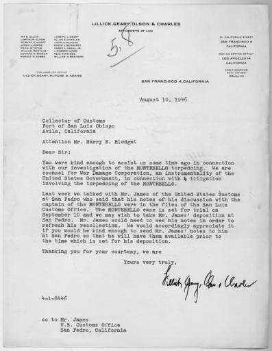 Keywords: Notification of Taking Deposition - NARA - 295007.jpg Scope and content Letter from the law firm of Lillick Geary Olson Charles counsel for the War Damage Corporation notifying the Collector of Customs at Port San Luis Obispo that a court trial had been set for September 10 1946 and that E F James would need his notes from the files at Port San Luis Obispo in order to refresh his memory about the sinking of the Montebello General notes 295007 Local identifier Department of the Treasury Customs Service Collection District of San Francisco Port of Delivery San Luis Obispo 1882 - 1926 NARA's Pacific Region Riverside NRHAR 23123 Cajalco Rd Perris CA 92570 date 1946 08 10 - 1946 08 10 Record group Record Group 36 Records of the U S Customs Service 1745 - 1997 Record group ARC 365 Records Relating to the Destruction of the S S Montebello compiled 12/23/1941 - 09/17/1946 Series ARC 295001 File unit File unit ARC Variant control numbers NAIL Control Number NRHL-36-MON1-6 Other versions <gallery> File Notification_of_Taking_Deposition_-_NARA_-_295007 tif tif File Notification_of_Taking_Deposition_-_NARA_-_295007 jpg jpg </gallery> NARA-cooperation PD-USGov Oil tankers Ship disasters in 1941 |