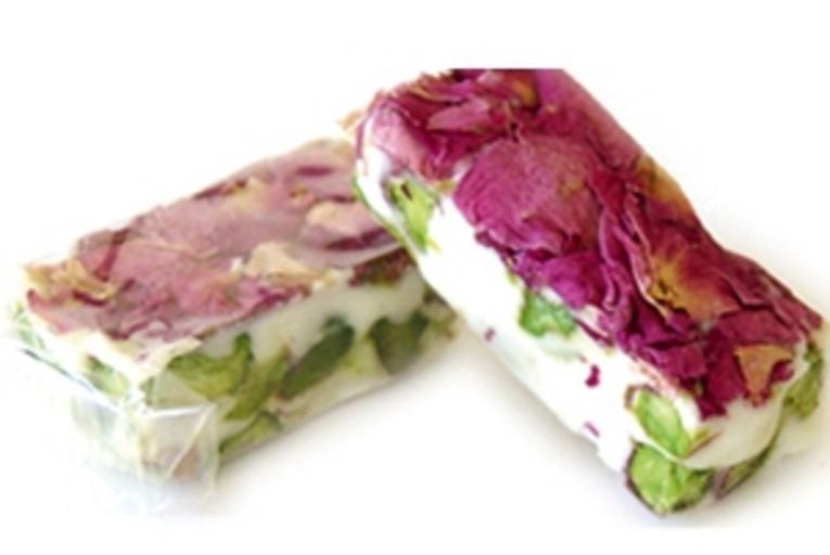 | Keywords: Nougat-damascene.jpg Nougat Damascene Petales de Rosess Pistache d'Alep www confiserie-de-luxe com 2006-12-24 Waeil Alostoiny Nougat Pistachio nuts as food Roses as food Purple Rosa × damascena Bars dessert Green pink white Cuisine des fleurs |