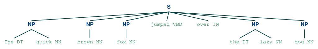 Keywords: Noun phrase chunking with NLTK.svg en Noun phrase chunking with NLTK Created with the following Python code see http //nltk googlecode com/svn/trunk/doc/book/ch07 html <source lang Python > import nltk sentence nltk tag pos_tag 'The quick brown fox jumped over the lazy dog' split grammar NP <DT> <JJ> <NN> cp nltk RegexpParser grammar result cp parse sentence result draw </source> 2012-04-23 own InverseHypercube cc-zero Uploaded with UploadWizard Syntax trees Images with Python source code |