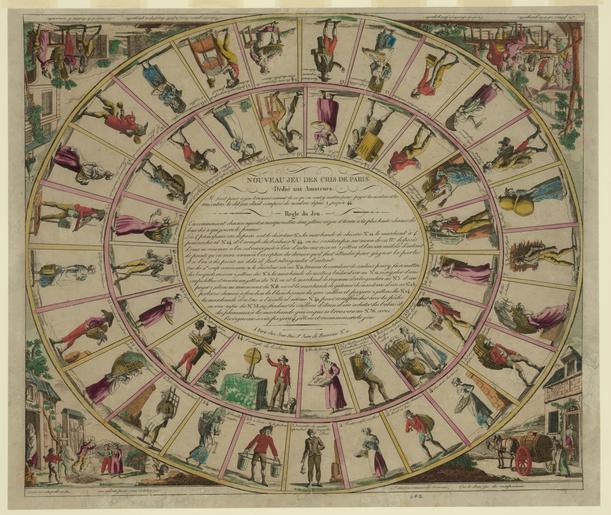 Keywords: Nouveau jeu des cris de Paris - Library of Congress.tif LargeImage Artwork Game board with 44 numbered pictorial compartments arranged in a spiral each representing one of the cries of Paris with the cry beneath; the final compartment crowned and wreathed in laurels representing a man handing out printed sheets and labelled l'Heureux and below Edit du Joieux Avenement ; in the centre the rules of the game; in the lower left corner a man standing on a scale whilst weights are placed on the other side to right two dogs one pissing on a parcel labelled N O the other defecating on some prints the whole labelled La Balance Royale ; in the lower right corner a merry-go-round labelled la Bague in the top right corner a crowd of people watching a play le Fameux Polichinel labelled Les Parades ; in the top left corner a man standing at a door holding a sack whilst another man pours the contents of a jug on his head from the window above a line of musicians along the bottom as though sitting in front of a stage labelled les Battus paient l'Amande print Institution LoC British Museum http //www britishmuseum org/research/search_the_collection_database/search_object_details aspx objectId 3009640 partId 1 Le Nouveau Jeu des Cris de Paris object history exhibition history credit line accession number LOC-image pga 03870 PD-100 Images of Paris from the Library of Congress Prints of Paris Games of France Cries of Paris |