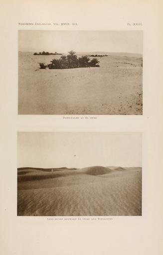 Keywords: NovitatesZoologicae18 Pl23.png en Above Date Palm plantings in the oasis of El Oued Algeria<br /> Below Sand dunes between El Oued and Touggourt Algeria Novitates Zoologicae http //www archive org/details/novitateszoologi18lond Volume 18 Plate 23 6-11 April 1909 upper photo taken 4-7 or 10-13 April 1909 lower photo taken 1912 published Walter Rothschild Ernst Hartert K Jordan editors PD-old-100 Novitates Zoologicae - volume 18 Nature of Algeria Flora of Algeria Flora of South Algeria El Oued French Algeria Phoenix dactylifera illustrations Dunes of Algeria 1909 photographs Algeria in the 1900s |