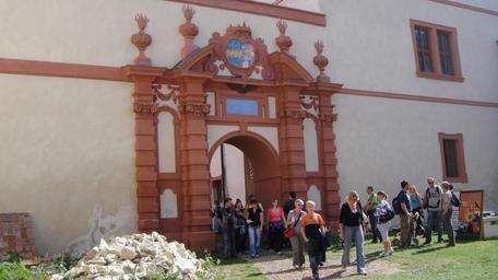 Keywords: Novy Hrad (Jimlin) Brana.JPG cs Brána ze druhého na třetí nádvoří Nového Hradu v Jimlíně own Bosquete 2010-09-05 Arms of alliance Coats of arms of Fahrensbach family Coats of arms of Schlick family Gates in Louny District Nový Hrad Jimlín