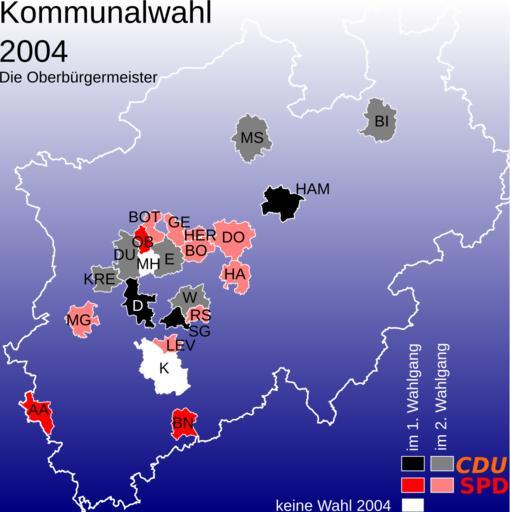 Keywords: NRW election 2004 Oberbuergermeister.svg en Map of the outcome of the local elections 2004 in North Rhine-Westfalia showing the party of the elected oberbürgermeister Lord Mayor de Karte mit den Ergebnis der Kommunalwahlen 2004 in Nordrhein-Westfalen Gezeigt ist die Parteizugehörigkeit des gewählten Oberbürgermeisters own Vinom 2009-03-24 own work basiert auf 100px Local elections in North Rhine-Westphalia 2004 |