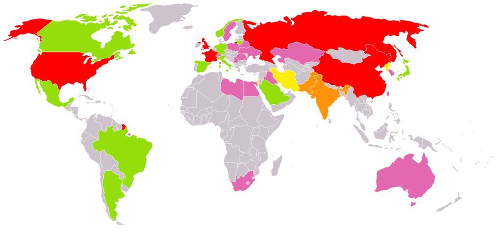 Keywords: Nuclear weapon programs worldwide 2.png Image of worldwide nuclear weapons programs as of September 2005 Based on info at en List of countries with nuclear weapons filled into Image BlankMap-World png originally by User Fastfission but now by others as well see below Rendered without labels for multi-lingual support Feel free to update this very easy using Photoshop or GIMP as reliable information changes <font color ED2024 >Rojo</font> Five nuclear weapons states from the NPT <font color FF940A >Anaranjado</font> Other known nuclear powers <font color ffff00 >Amarillo</font> States suspected of having possession of or suspected of being in the process of developing nuclear weapons and/or nuclear programs <font color E368B0 >Morado</font> States which at one point had nuclear weapons and/or nuclear weapons research programs <font color 7cfc00 >Verde</font> Other states capable of developing nuclear weapons Historical states have been represented by their successor states i e Yugoslavia by Serbia and Montenegro as they apparently inherited the nuclear materials of the socialist state after it fragmented 2006-08-05 own assumed Robotico Distributional maps of the world Nuclear proliferation Maps needing South Sudan political boundaries |