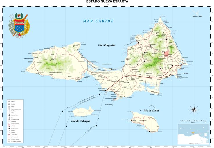 Keywords: Nueva Esparta Mapa Vial.svg stato Nueba Esparta Estat de Nueva Esparta Nueva Esparta Karte von Nueva Esparta Nueva Esparta New Sparta is one of the 23 states estados of Venezuela It comprises Margarita Island by far the largest and most important island Coche and uninhabited Cubagua The state is the smallest one in area and is located off the northeast Caribbean coast of Venezuela It is the only insular state of Venuezuela Its name comes from the heroísm shown by its inhabitants during the Venezuelan War of Independence deemed similar to that of the Spartan soldiers of Ancient Greece The main island of Margarita alone has an area of 934 km² In 1909 the state was constituted and in 1947 the island of Cubagua was added Its capital city is La Asunción but the main urban center is Porlamar Nueva Esparta es un estado federal de Venezuela ubicado al noreste del país siendo el único Estado Federal insular y el de menor superficie de la nación El estado posee gran cantidad de monumentos históricos en la iglesia de Santa Ana fue declarada la Tercera República de Venezuela y Simón Bolívar su presidente El Estado fue designado con ese nombre a partir del 12 de mayo de 1817 con el propósito de hacer un homenaje al heroísmo de los habitantes de la isla de Margarita durante la guerra de Independencia de Venezuela calificado como Heroísmo espartano porque hizo recordar la valentía de los ciudadanos de la capital de la porción de Laconia Esparta en la península del Peloponeso en la antigua Grecia Aquí nacieron Luis Beltrán Prieto Figueroa Santiago Mariño y otros grandes personajes de la historia regional y nacional L État de Nueva Esparta « Nouvelle Sparte » est un des 23 États estados du Venezuela Il comprend les îles de Margarita de loin la plus grande et plus importante avec une surface de 934km² à elle seule Coche et Cubagua inhabitée C est le seul État insulaire du Venezuela et le plus petit de la région il est localisé sur la côte antillaise au nord-est du Venezuela Son nom vient de l héroïsme montré par ses habitants durant la guerre d indépendance vénézuelienne jugé semblable à celui des soldats spartiates de la Grèce antique L État a été constitué en 1909 et l île de Cubagua a été ajoutée en 1947 Sa ville capitale est Asunción mais le principal centre urbain est Porlamar Nueva Esparta Nueva Esparta ベネズエラ ヌエバ・エスパルタ州の 図 Nueva Esparta Nueva Esparta Nueva Esparta Nueva Esparta Nueva Esparta Estado de Nueva Esparta уэва-Эспа та Nueva Esparta Nya Sparta en delstat i Venezuela Иёлоти уэва Эспа та 新埃斯帕塔州 Own data obtained traveling across the zone with a GPS Coat of arms File Escudo Nueva Esparta svg 2007 User The Photographer/info cc-zero Map of Nueva Esparta svg Venezuela Nueva Esparta location map svg <gallery> File Division Politico Territorial Nueva Esparta svg File Nueva_Esparta_Mapa_Interactivo jpg </gallery> picture of the day 2009 12 14 Assessments 5 2008 1 1 Translation possible Created with Inkscape Maps of Isla Margarita Maps of Nueva Esparta Maps of islands of Venezuela SVG maps in Spanish Featured pictures of Isla Margarita Featured pictures on Wikimedia Commons - vector Featured pictures by User The Photographer Unassessed QI candidates Drawings by The Photographer Files by The Photographer Images of Venezuela by User The Photographer |