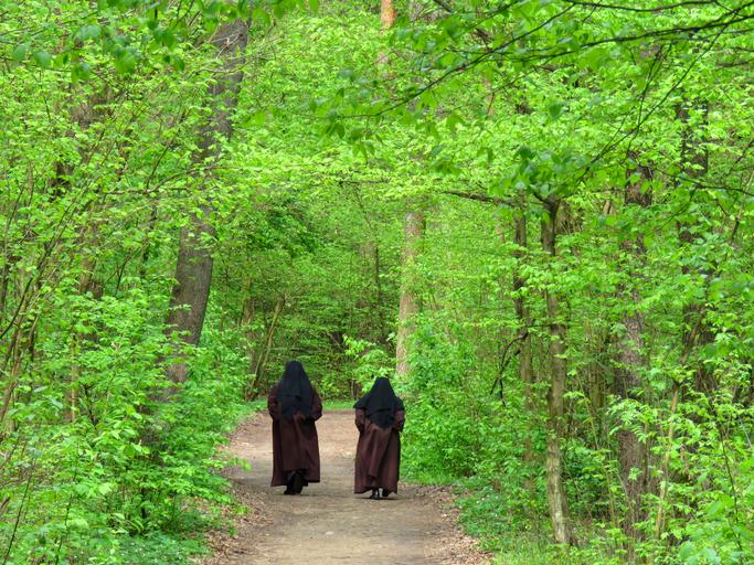 Keywords: nuns spacer spring green forest conversation prayer way the path