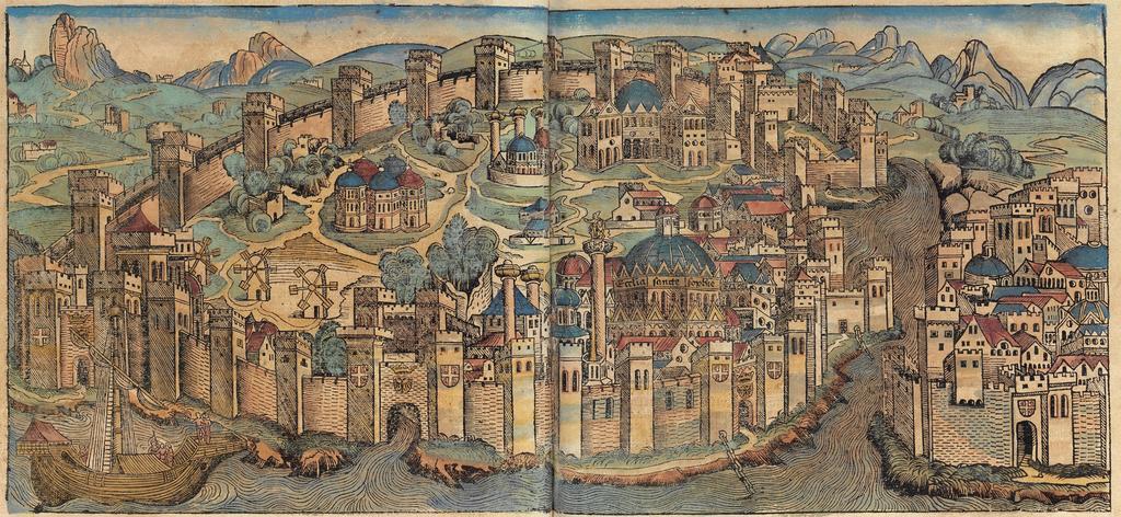Keywords: Nuremberg chronicles - CONSTANTINOPEL.png Konstantinopel aus der Schedel'schen Weltchronik Blatt 129v/130r en Woodcut of Constantinople from the Nuremberg Chronicle own scan from original book 1493 Michel Wolgemut Wilhelm Pleydenwurff Text Hartmann Schedel PD-old-100 <gallery> File Schedelsche Weltchronik d 130 jpg The complete pages with text File Constantinople woodcut from Schedel's Weltchronik 1493 png Uncoloured version the original woodcut only </gallery> Nuremberg Chronicle Towns Nuremberg Chronicle illustrations f 121-130 130 Constantinople 1493 |