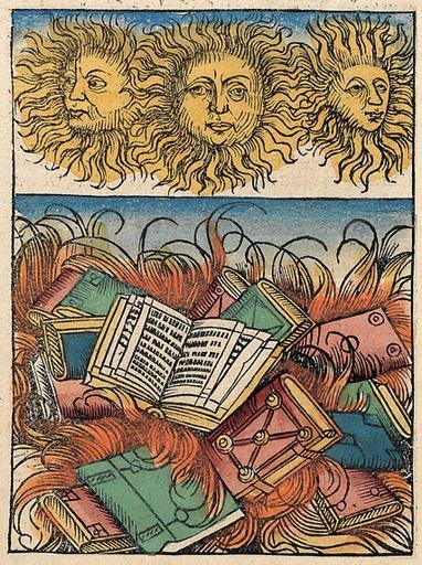 Keywords: Nuremberg chronicles f 092v 1.png This is a part of a scan of an historical document Title Schedelsche Weltchronik or Nuremberg Chronicle own scan from original book 1493 Hartmann Schedel Author died more than 70 years ago - public domain PD-old-100 Nuremberg Chronicle illustrations f 091-100 092v 1 Natural events in the Nuremberg Chronicle Miracles in the Nuremberg Chronicle Burning books Book burning in art |