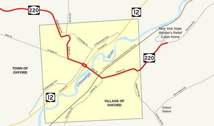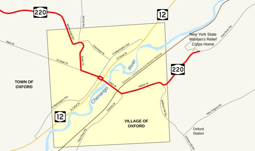 Keywords: NY 220 original routing in Oxford.svg New York State Route 220 in Oxford New York Features traced in Inkscape from a http //www nysgis state ny us/gisdata/quads/drg24/usgspreview/index cfm code o42075d5 1949 USGS topographic map of Oxford The routing of NY 220 east of the Chenango River was not marked on the topographic map but is clearly marked on a 1940 Rand McNally map of New York and implicitly marked on prior maps as well Own TwinsMetsFan 2009-05-23 New York State Route 220 Road maps of New York |