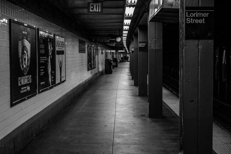 Keywords: nyc subway underground transportation platform new york city urban black and white