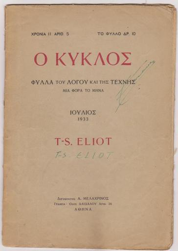 Keywords: O Kyklos magazine July 1933 T-S Eliot.JPG el Ο Κύκλος λογοτεχνικό εριοδικό Ιούλιος 1933 Αφιέρωμα στον T S Eliot 2014-06-28 10 05 02 http //www old-books gr/files/image/cover/31601 JPG Kyklos magazine Custom license marker 2014 06 28 PD-old Uploaded with UploadWizard O Kyklos |