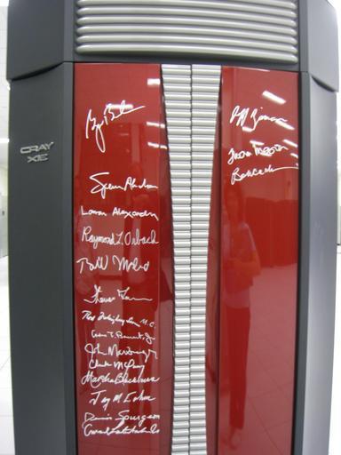 | Keywords: Oak Ridge - autographed Cray XE.JPG Cray X1E supercomputer autographed by President George Bush and others Oak Ridge National Laboratory Oak Ridge Tennessee USA This machine was in an unclassified area and there were no prohibitions against photography when I visited the machine room own 2009-05-22 Daderot Public domain Cray X1E |