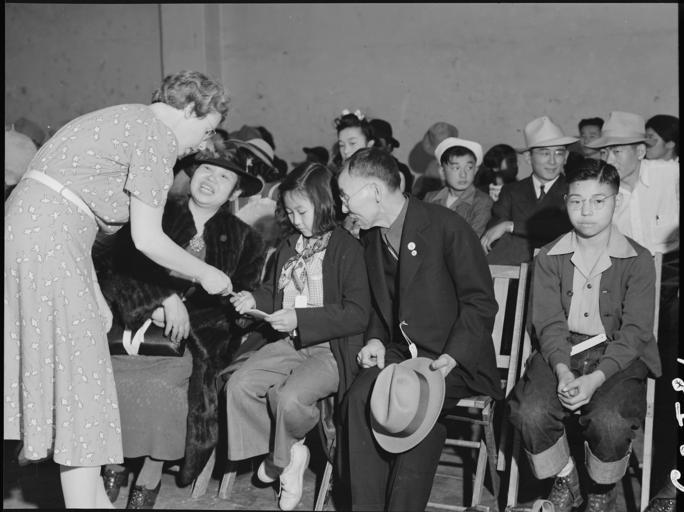 | Keywords: Oakland, California. Mr. and Mrs. Kitagaki with two of their children at the Wartime Civil Control . . . - NARA - 537891.jpg Scope and content The full caption for this photograph reads Oakland California Mr and Mrs Kitagaki with two of their children at the Wartime Civil Control Administration station a few minutes before departure by bus for Tanforan Assembly center A local church member is handing Kimiko a pamphlet expressing the good wishes of the church toward the departing evacuees Mr Kitagaki prior to evacuation was in the cleaning and dyeing business General notes 537891 Local identifier 210-G-C581 Department of the Interior War Relocation Authority 02/16/1944 - 06/30/1946 NARA-Author Lange Dorothea 1895-1965 Photographer 1372774 <br /> Still Picture Records Section Special Media Archives Services Division NWCS-S National Archives at College Park 8601 Adelphi Road College Park MD 20740-6001 1942-05-06 Record group Record Group 210 Records of the War Relocation Authority 1941 - 1989 Record group ARC 537 Central Photographic File of the War Relocation Authority compiled 1942 - 1945 Series ARC 536000 File unit File unit ARC Variant control numbers NAIL Control Number NWDNS-210-G-C581 Other versions <gallery> File Oakland _California _Mr _and_Mrs _Kitagaki_with_two_of_their_children_at_the_Wartime_Civil_Control_ _ _ _-_NARA_-_537891 tif tif File Oakland _California _Mr _and_Mrs _Kitagaki_with_two_of_their_children_at_the_Wartime_Civil_Control_ _ _ _-_NARA_-_537891 jpg jpg </gallery> NARA-cooperation PD-USGov Dorothea Lange Japanese American internment processing in Oakland |