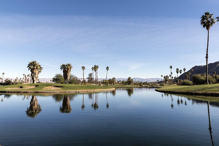 Keywords: oasis desert resort water palms trees landscape sky sun mountains green southwest leisure relax game lifestyle sand golfing course
