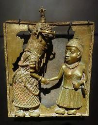 Keywords: Oba Akenzua II greets Queen Elizabeth II, Benin City, Nigeria, No. 2010.01.0001 - Etnografiska museet - Stockholm, Sweden - DSC01010.JPG en Exhibit in the Etnografiska museet Stockholm Sweden Bronze plaque depicting the meeting between Akenzua II Oba of Benin and Queen Elizabeth II during the latter's visit to Nigeria in 1956 Cast in 2009 by the Oba's grandson Uyi Omodamwen born 1974 and donated to the museum in 2010 Photography was permitted in the museum without restriction em 1538749 2010 01 0001 yes photo 2014-09-16; plaque 2009 own Photographer Daderot Bronze by Uyi Omodamwen other versions cc-zero Benin bronzes in the Etnografiska museet Uploaded with UploadWizard |