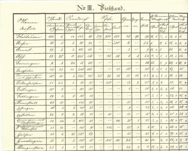Keywords: Oberamt Blaubeuren Tabelle 3a.jpg de Dies ist ein Scan des Buches en This is a scan of the book Beschreibung des Oberamts Blaubeuren Cotta Stuttgart und Tübingen 1830 Blaubeuren Stadt im Alb-Donau-Kreis /Baden-Württemberg Source de Scan einer Faksimileausgabe Bissinger Magstadt 1976 ISBN 3-7644-0007-2 en Scan from facsimile edition Bissinger Magstadt 1976 ISBN 3-7644-0007-2 Date 1830 Author Prof Johann Daniel Georg von Memminger 1773-1840 Oberamt Blaubeuren PD-old |