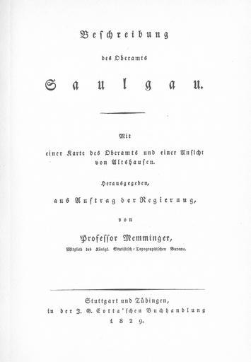 | Keywords: Oberamt Saulgau 002.jpg de Dies ist ein Scan des Buches en This is a scan of the book Beschreibung des Oberamts Saulgau J G Cotta'sche Buchhandlung heute Teil des Landkreises Sigmaringen Baden-Württemberg Source de Scan einer Faksimileausgabe Bissinger Magstadt 1982 ISBN 3-7644-0006-4 en Scan from facsimile edition Bissinger Magstadt 1982 ISBN 3-7644-0006-4 Date 1829 Author Johann Daniel Georg von Memminger Stuttgart 1773-1840 PD-old Beschreibung des Oberamts Saulgau | ||||
