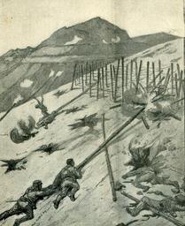 Keywords: Obstacle.jpg Japonais détruisant à l'aide de bombes emmanchées de perches de bambou les obstacles en fil de fer des Russes Le Patriote Illustré 04-12-1904 loki11 PD-old-100 Russo-Japanese War in December 1904 Military tactics