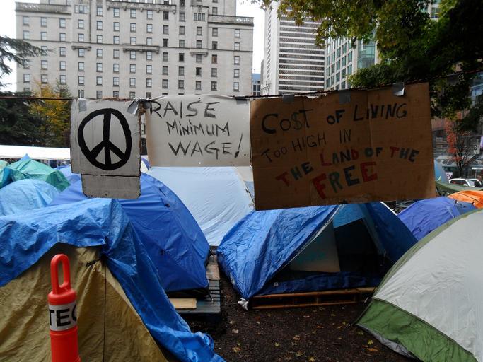 | Keywords: Occupy Vancouver tents.jpg en Occupy Vancouver tents and a peace sign a sign that reads RAISE MINIMUM WAGE and another that reads COST OF LIVING TOO HIGH IN THE LAND OF THE FREE 2011-10-20 own Eviatar Bach cc-zero Uploaded with UploadWizard Occupy Vancouver Banners and signs at demonstrations and protests by the Occupy movement Files by User InverseHypercube |