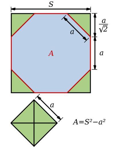 Keywords: Octagon in square.svg en An octagon of side length a in a circle of side length S where S is the span of the octagon The area of the octagon A is then given by <math>A S 2-a 2</math> own Inductiveload 2009-03-22 Regular octagons