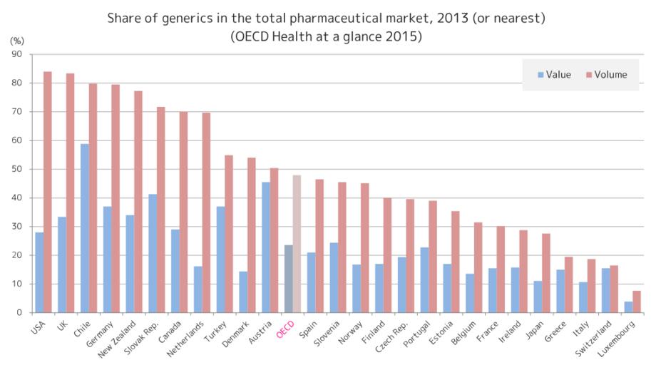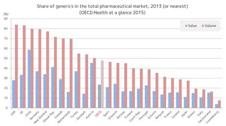 Keywords: OECD generic pharmaceuticals share.svg en OECD HealthData generic medicine market <br>OECD Health at a glance 2015 2014-01-13 12 52 54 own Yuasan cc-zero Health statistics