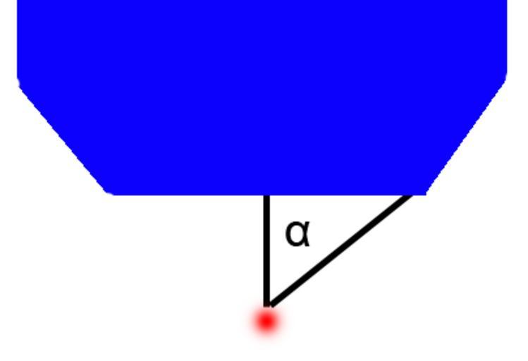Keywords: Oeffnungswinkel.png en Scheme of the half-acceptance angle alpha of a microscope objective here about 50° de Schema des halben Öffnungswinkels alpha eines Mikroskopobjektivs hier etwa 50° own Dietzel65 2013-10-26 Drawings of microscopes