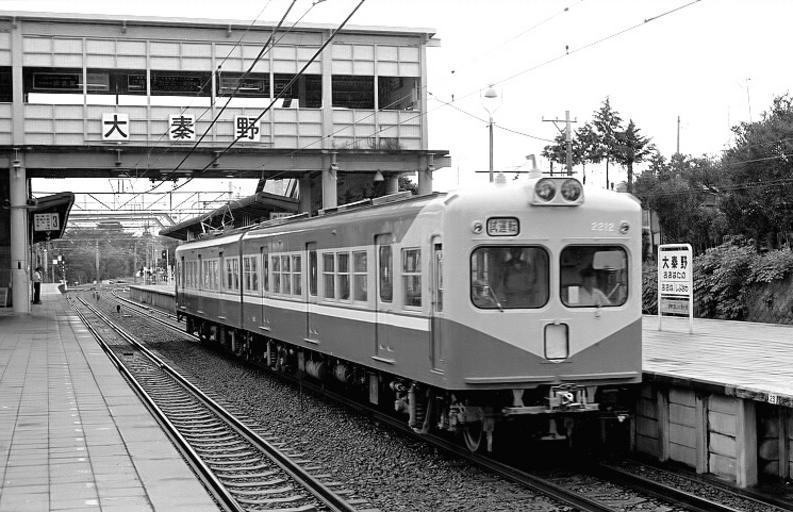 Keywords: Oer2212 in fujikyu livery.JPG en Odakyu Electric Railway 2200 type EMU in Fujikyuko livery on the test run at Ohatano station ja 富士 行塗装で試運転中の小田 電鉄2200形電車 大秦野駅にて own Shellparakeet 1982-08-30 Cc-zero 1982 in rail transport in Japan Black and white photographs of Japan in the 1980s Black and white photographs of trains in Japan Odakyu 2200 series Hadano Station Test run |