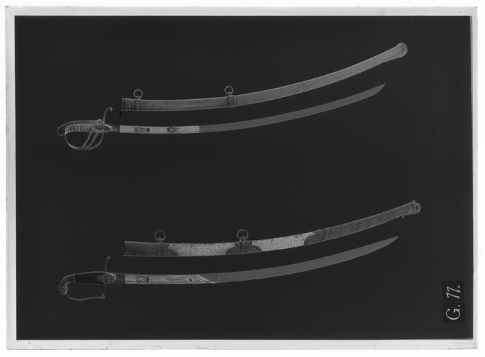 Keywords: Officerssabel, Frankrike ca 1815-1818, tillåten modell, Sverige - Livrustkammaren - 777-negative.tif Fäste av förgylld reliefornerad mässing kavelns sidostycken av pärlemor <br/><br/>Kappa framtill i form av ett lejonhuvud med manen inramad av en slät list och baktill övergående i ett insvängt och nedåtböjt mellanled på vars översida ett palmettliknande ornament Nederdelen formad som en nedåtriktad fjällmönstrad holk Handbygel platt överdelen intappad i lejonets gap nederdelen insvängd och med ett spiralornament rätvinkligt övergående i den raka främre parerstången; handbygelns utsida ornerad med en längsgående bladranka något ovanför mitten en infälld trofégrupp Bakre parerstång rak med nedåtböjd ytterände formad som en palmett Styrskenor med tvärt avskuren överdel och vidgad rundad nederdel den förra ornerad med ett palmettliknande ornament den senare med en mansmaskaron omgiven av bladornament <br/>Kavel med rektangulärt tvärsnitt avsmalnande uppåt de smala fram- och baksidorna belagda med en 15mm bred bård av förgylld mässing ornerad med en längsgående tuktad lagerranka; ut- och insidorna belagda med släta pärlemorskivor med en bredd nedtill av 35 mm <br/><br/>Klinga böjd eneggad utom vid det tvåeggade spetspartiet; ryggen plan Fram till spetsen en bred grund hålkäl Starka delen med etsad och förgylld ornering mot blånerad botten som upptill är snett avskuren mot eggsidan; ryggpartiet förgyllt den blånerade bottnen med en smal förgylld kantbård Baspartiet med ett förgyllt rektangulärt fält vari tecknat med tunna linjer trekronorsvapnet i oval sköld mot tvärstreckad botten över skölden en girland Ovanför baspartiet under svensk hertigkrona ett graverat monogram i skrivstil C J det hela förgyllt Upptill en femuddig förgylld stjärna omgiven av strålar original caption - 1815 1818 brass b1 - blankvapen - fäste material mässing - mother-of-pearl b6 - blankvapen - kavel och kavelklädsel material pärlemor - steel b2 - blankvapen - klinga material stål size mm 1024 size mm 132 size mm 880 klinga size mm 32 klinga g 800 LRK C J hertigkrona anv b5 - blankvapen - klingdekor; Karl XIV Johan av Sverige-Norge C J hertigkrona anv b5 - blankvapen - klingdekor; Karl XIV Johan av Sverige-Norge place of origin original filename LN_B04890_007770 49849 inventory number LRK 13321 777 CC0 Officerssabel Frankrike ca 1815-1818 tillåten modell Sverige - Livrustkammaren - 777 tif |