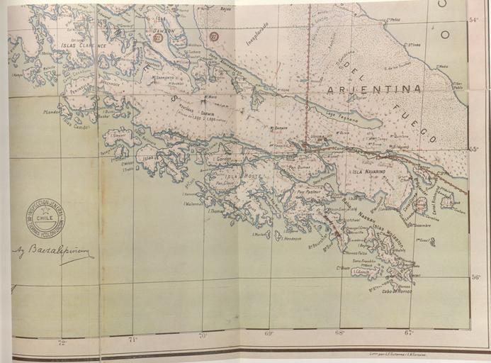 | Keywords: Oficina.de.demarcacion.Chile.jpg MAPA DE LA REGION AUSTRAL DE CHILE 1904 Se reproduce aqui parcialmente el «Mapa de la region austral de Chile provincias de Llanquihue Chiloe y territorio de Magallanes formado con los estudios hechos por las comisiones de limites de Chile y Argentina Marinas de ambos paises ingenieros de colonizacion y algunos exploradores particulares» En el mapa se anota que este ha sido «Aprobado por la Oficina de Demarcacion de Limitese Inspeccion de Tierras y Colonizacion» de Chile En la region del extremo austral el limite internacional esta trazado por el centro del canal Beagle Las islas Picton Nueva y Lennox asi como todas las otras islas e islotes que se extienden al sur hasta el cabo de hornos aparecen bajo soberania chilena Relaciones Chileno-Argentinas La controversia del Beagle edited by chilean Foreign Affairs Geneve Switzerland 1979 1904 author PD-old Maps related to the Beagle conflict Cape Horn Maps of Tierra del Fuego |
