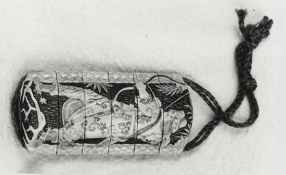 | Keywords: Ogawa Haritsu - Inro with a Western Bowman Aiming at a Faun - Walters 492275.jpg A standard shape light ceramic five compartment Inro ” decorated in ceramic relief with a faun holding a reed pipe The reverse with a European archer with brown hair and flowered coat wearing spurs Both in relief and with blue and green glazes The archer's robe with scrolls and flowers in dark blue green and red The hair is light brown The light cord runners with scales and the brown background incised to imitate tree bark Spurious signature and date in raised lacquer characters within an irregularly shaped gold lacquer section on the bottom of the inro The interior has a turquoise glaze The cord channels are external ca 1743 Edo earthenware with overglaze enamels and gold lacquer Inro cm 10 1 4 6 2 8 accession number 49 2275 30783 William T / Henry Walters Collection Baltimore date and mode of acquisition unknown Walters Art Museum Henry Walters Acquired by William T or Henry Walters Signature Horeki san nen haru / Haritsu zo; Translation Made by Haritsu in the spring of the third year of Horeki 1753 place of origin Edo present-day Tokyo Japan Walters Art Museum license Art of Japan in the Walters Art Museum Ogawa Haritsu Ceramic reliefs Inro 18th-century reliefs Reliefs from Japan Earthenware from Japan |