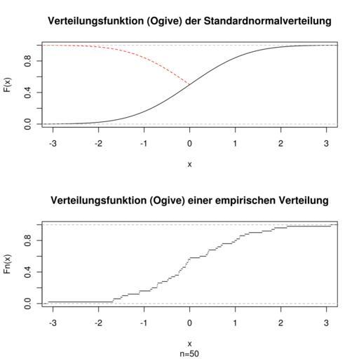 | Keywords: Ogive.svg en Cumulative distribution function for a theoretical and empirical distribution as example for Ogive own Sigbert 2010-11-13 v svg ogive svg par mfrow c 2 1 x <- -350 350 /100 x2 <- -350 0 /100 plot x pnorm x type l xlim c -3 3 main Verteilungsfunktion Ogive der Standardnormalverteilung ylab F x lines x2 1-pnorm x2 lty 2 col red abline h 0 lty 2 col gray abline h 1 lty 2 col gray n <- 50 y <- sort rnorm n plot ecdf y cex 0 xlim c -3 3 main Verteilungsfunktion Ogive einer empirischen Verteilung sub sprintf n i n dev off Cumulative distribution functions Cumulative frequency distribution |