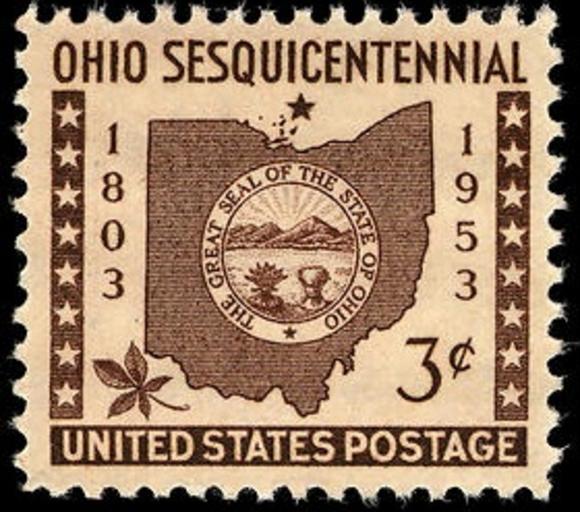 Keywords: Ohio statehood 1953 U.S. stamp.1.jpg en Ohio commemorated its 150th anniversary on a 3-cent stamp issued March 2 1953 The central design features the state seal imposed on a map outline of the state It is flanked by sixteen stars representing states admitted previously a seventeenth star representing Ohio in the top center and a buckeye leaf in the lower left 2014-04-10 06 52 37 Arago people postage the post online National Postal Museum Bureau of Printing and Engraving PD-USGov Uploaded with UploadWizard U S territories on stamps Stamps of the United States 1951-1960 |